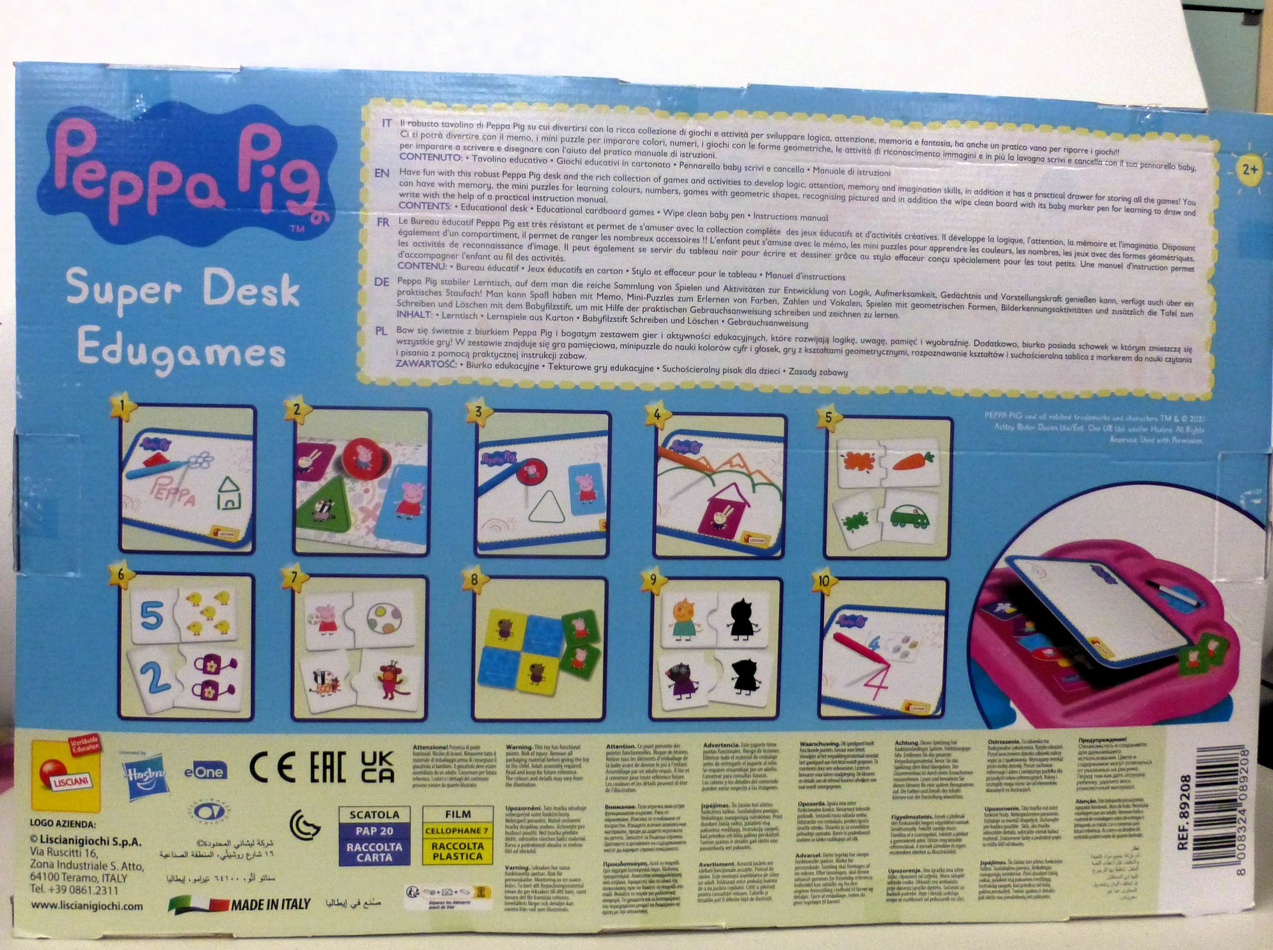 A mesa inclui 10 jogos educativos divertidos e fáceis da Peppa Pig com muitas cenas dos desenhos animados da Peppa Pig: quadro branco com marcador e esponja para escrever e apagar o que imaginar as vezes que quiseres, jogo de correspondência de formas geométricas, jogo de desenho de contornos de formas geométricas, jogo de desenho livre utilizando os contornos das formas geométricas desenhadas no jogo anterior, minijogo de quebra-cabeças para aprender cores e números, jogo de associação de quantidades e números, jogo de memória, jogo de associação de silhuetas-personagens e jogo de escrever os primeiros números. A mesa pedagógica tem um espaço de arrumação integrado para guardar os jogos e todos os materiais, bem como compartimentos para marcadores ou quaisquer outras ferramentas necessárias para os ter sempre à mão. Inclui instruções e parafusos para uma montagem fácil.