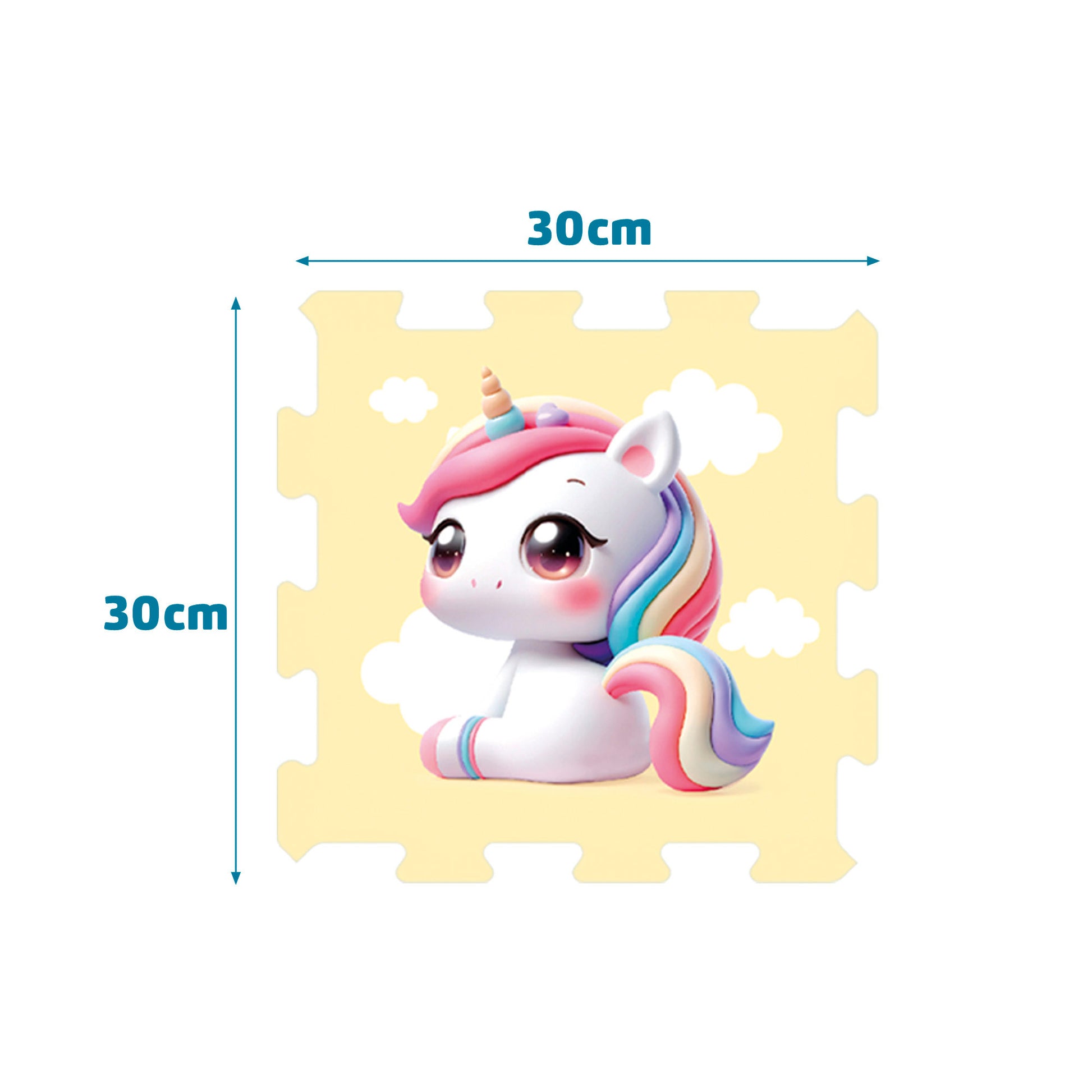 Este rompecabezas incluye 8 piezas de goma EVA, un material seguro que ofrece comodidad a los pequeños mientras juegan. Cada pieza está decorada con ilustraciones del mágico mundo de los unicornios y puede montarse como alfombra para gatear o jugar, ensamblarse en forma de cubo para guardar peluches u otros juguetes, o combinarse de otras formas que se adapten al juego y a la imaginación de cada niño.
