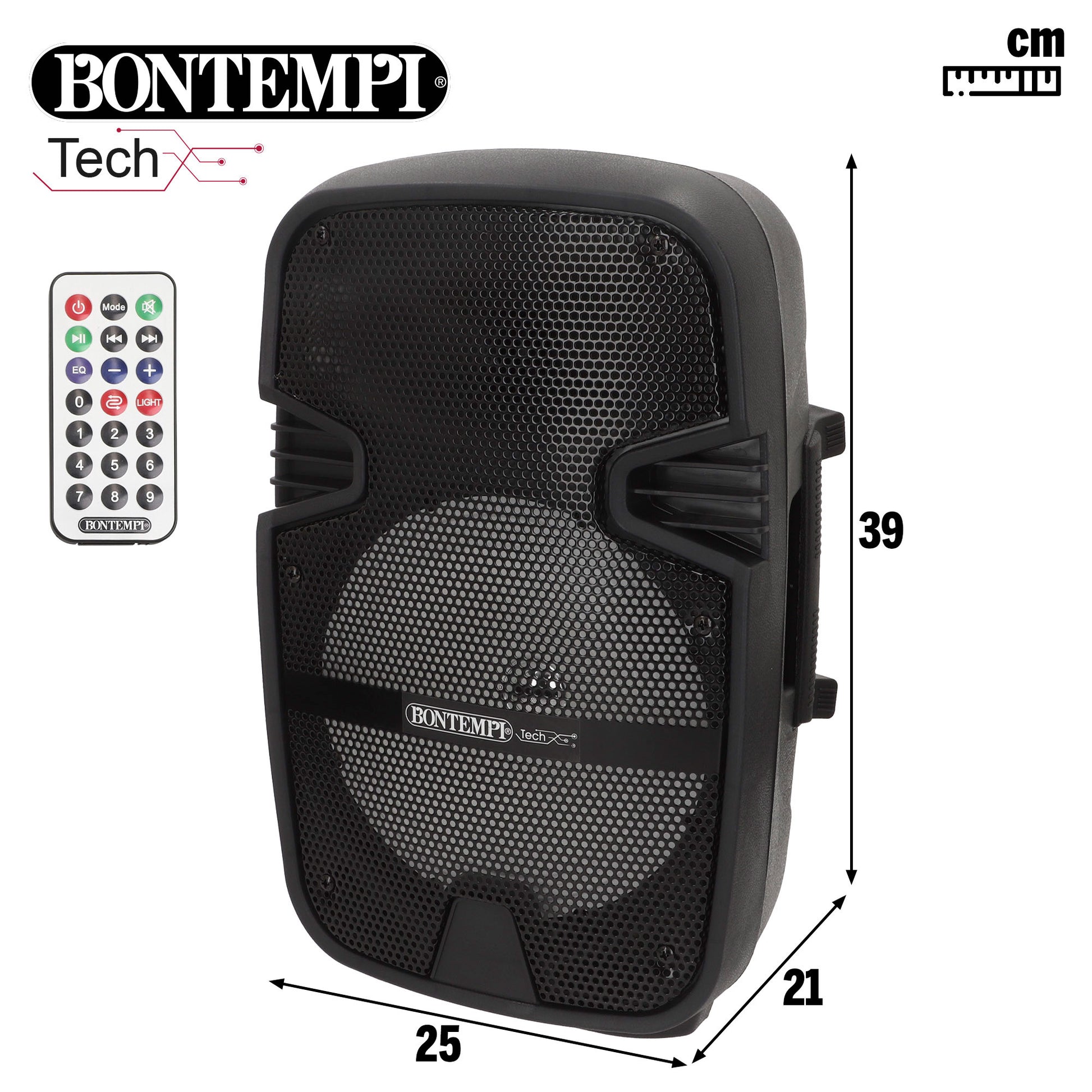 Este altavoz viene con 1 micrófono con cable incluido, luces RGB integradas que ambientan cualquier espacio, un mando que permite manejar los controles del altavoz a distancia, botones de control para volumen, graves y bajos, ecualizador, puerto USB, conectividad inalámbrica y función de radio. También incorpora batería recargable con carga por USB y la posibilidad de sincronizarlo con otro altavoz Bontempi del mismo modelo mediante la función TWS.