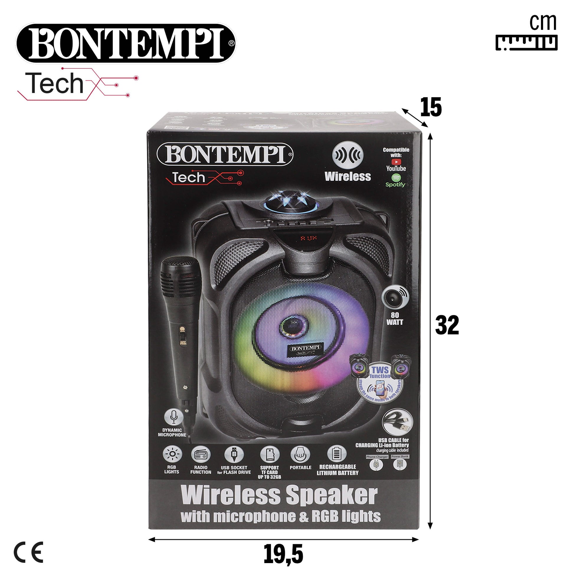 EsseColuna de som sem fios BontempiÉ o companheiro ideal para qualquer festa ou reunião. Com o seuPotência de 80 We a iluminação vibrante doluzes RGBDesfrutará de um som potente e envolvente, perfeito para eventos ou karaoke. A sua conectividade é incrivelmente versátil:Pode ligá-lo facilmente sem fios ao seu telemóvel, tablet ou computador., qualquerLigue dispositivos externos utilizando o cabo auxiliar incluído.Além disso, com oFunção TWSPode ligar duas colunas do mesmo modelo para desfrutar de som de qualidade.som estéreoSe preferir, pode reproduzir música a partir de umcartão microSD ou pen USBTem até um rádio para que possa sintonizar as suas estações favoritas!
