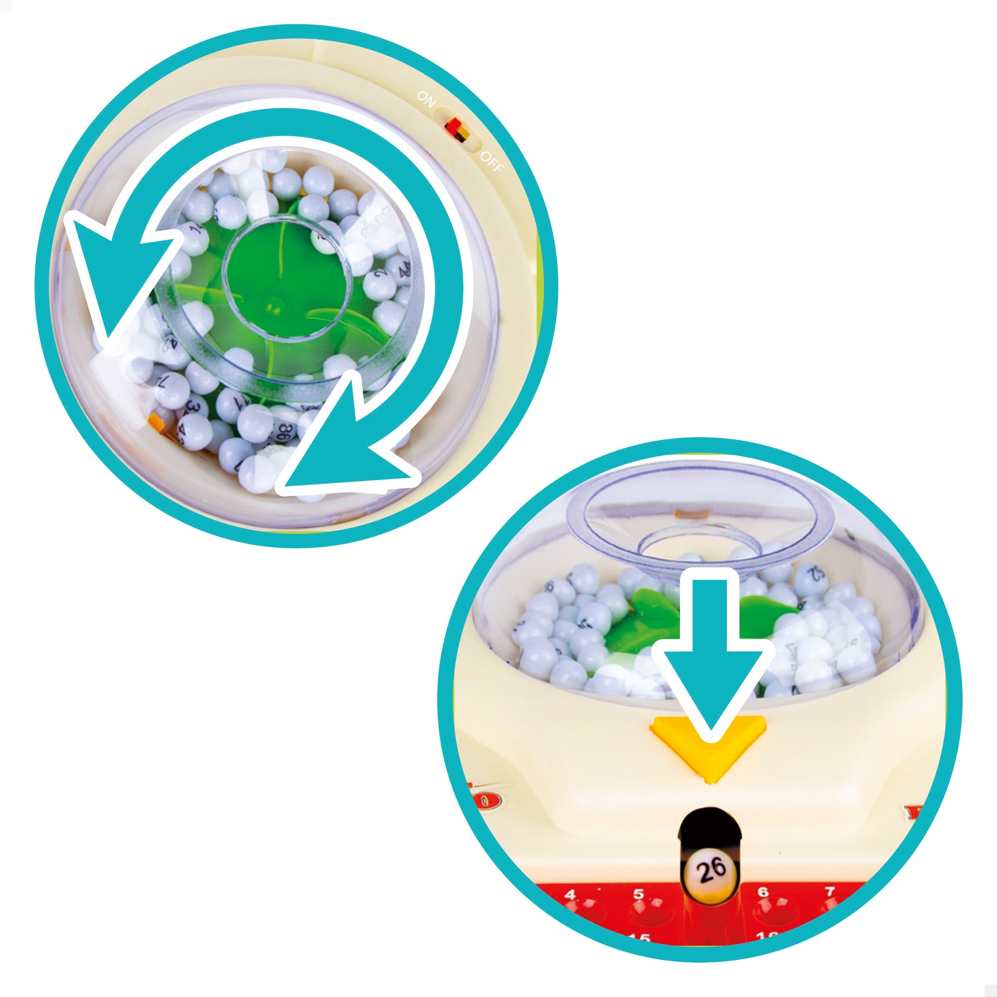 Os clássicos nunca falham! Divirta-se em família com este jogo de bingo eletrónico da CB Games (21,5 x 37 x 9,5 cm). Inclui 90 bolas numeradas (Ø1 cm), 48 cartões de bingo para jogo de grupo, fichas e um tabuleiro com um tambor eletrónico. As bolas são colocadas no tambor transparente, que gira para as misturar. Ao premir o botão, uma bola é ejetada pela abertura e pode ser colocada nos espaços numerados. Disponível em três cores sortidas, que serão enviadas aleatoriamente mediante disponibilidade: vermelho, amarelo e verde. Funciona com 4 pilhas AA (não incluídas). Recomendado para crianças a partir dos 6 anos.