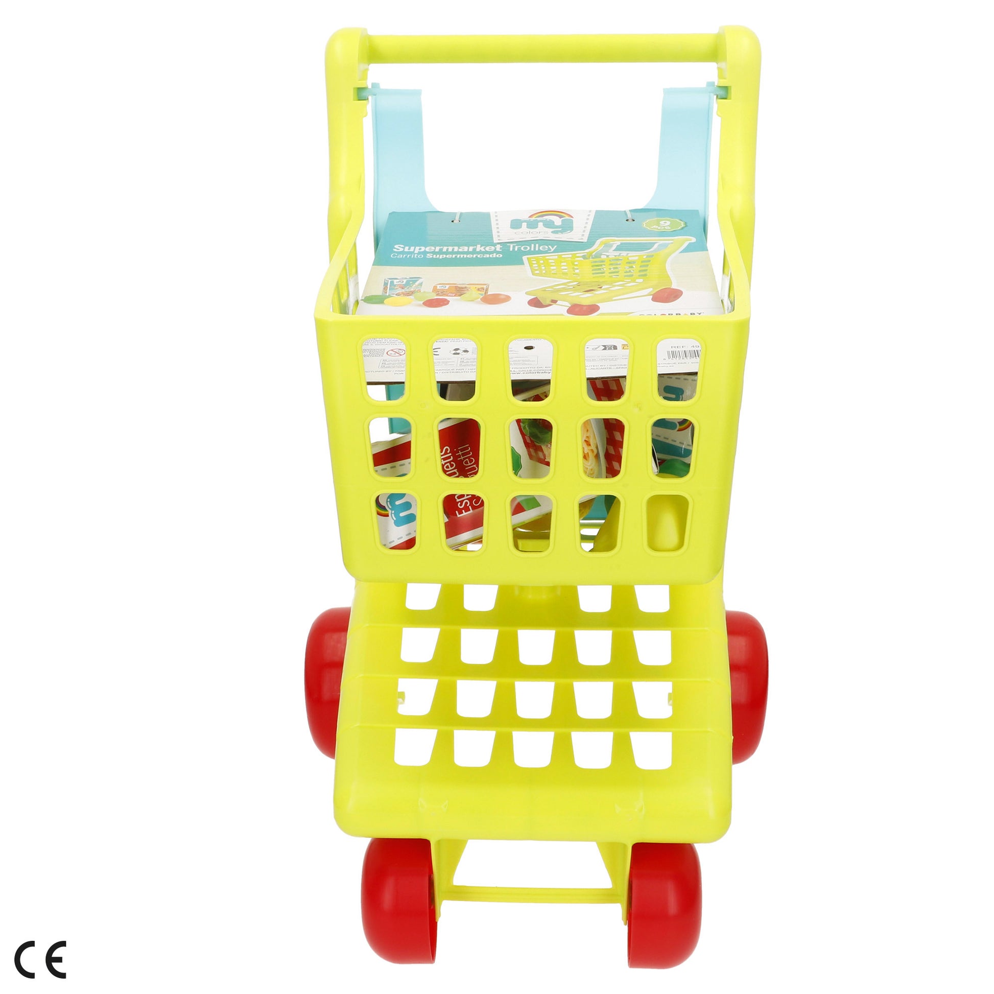 Ir ao supermercado com o carrinho de compras ColorBaby é muito divertido, pois tem todos os detalhes de um carrinho de compras real. As crianças podem colocar todos os alimentos que desejam comprar no cesto enquanto empurram a sua boneca para o assento incorporado. O carrinho inclui 7 artigos de comida de brincar. Mede 29x35x50 cm e é compatível com outros carrinhos de compras idênticos.