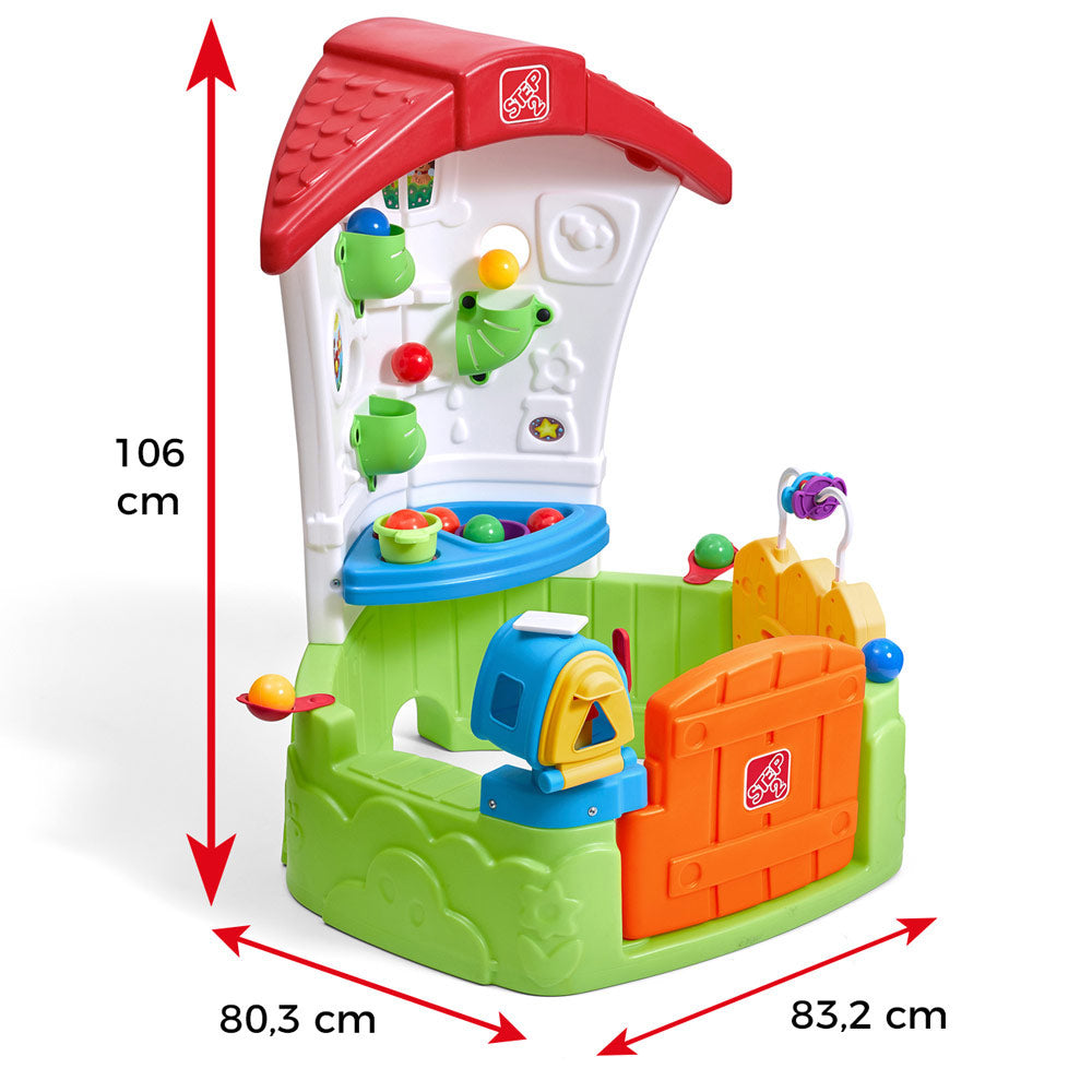 Casinha de Brincar Cbtoys Corner. Uma casinha de brincar interativa só para eles, onde podem brincar e aprender! Feita em plástico, mede 106 x 80 x 82 cm. As crianças podem entrar pela porta móvel e divertir-se com o jogo das bolas na parede. Podem lançar as bolas coloridas pelo labirinto e recolhê-las na pia da cozinha em miniatura. E a diversão continua lá fora! O portão de jardim é removível e funciona como um brinquedo interativo com engrenagens giratórias e peças móveis que ajudam a desenvolver a motricidade fina. Além disso, podem levantar as suas correspondências! A casinha tem uma caixa de correio com uma bandeirinha e uma porta que abre e fecha como uma verdadeira. Vão divertir-se muito!