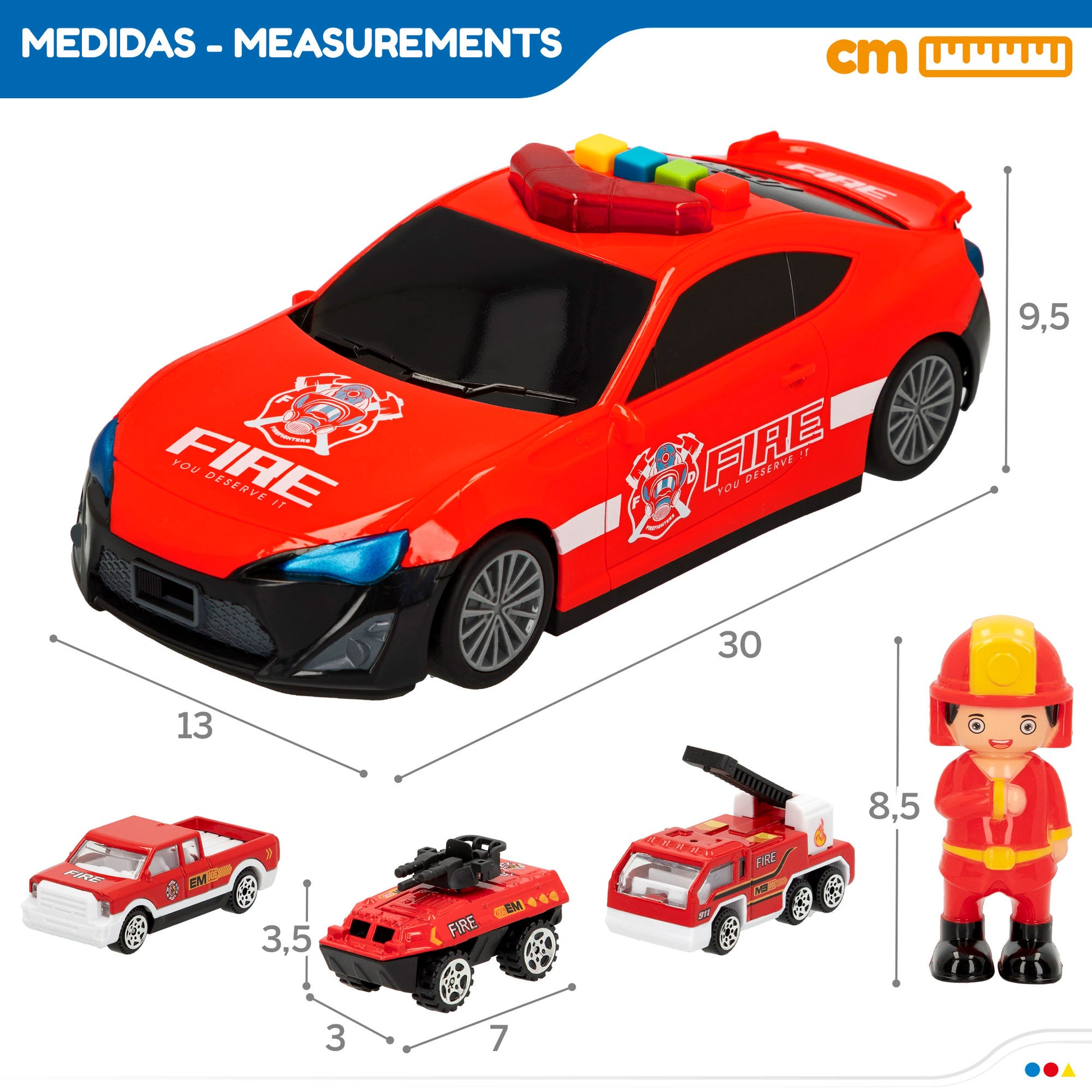 Pronto para a ação! O camião de bombeiros Speed & Go está totalmente equipado e pronto para apagar incêndios num instante. Este camião de bombeiros com luzes e sons inclui um compartimento para carros, três veículos de fricção à escala 1:64 e uma figura de bombeiro para supervisionar a missão. O camião de bombeiros tem botões coloridos no tejadilho que ativam diferentes sons e luzes. Estes carrinhos com luzes e sons estimulam os sentidos da audição e da visão das crianças, desenvolvem a compreensão de causa e efeito através da interação com os botões e incentivam a brincadeira imaginativa. Recomendado para crianças a partir dos 3 anos. Necessita de 3 pilhas AG13/LR44 (incluídas).