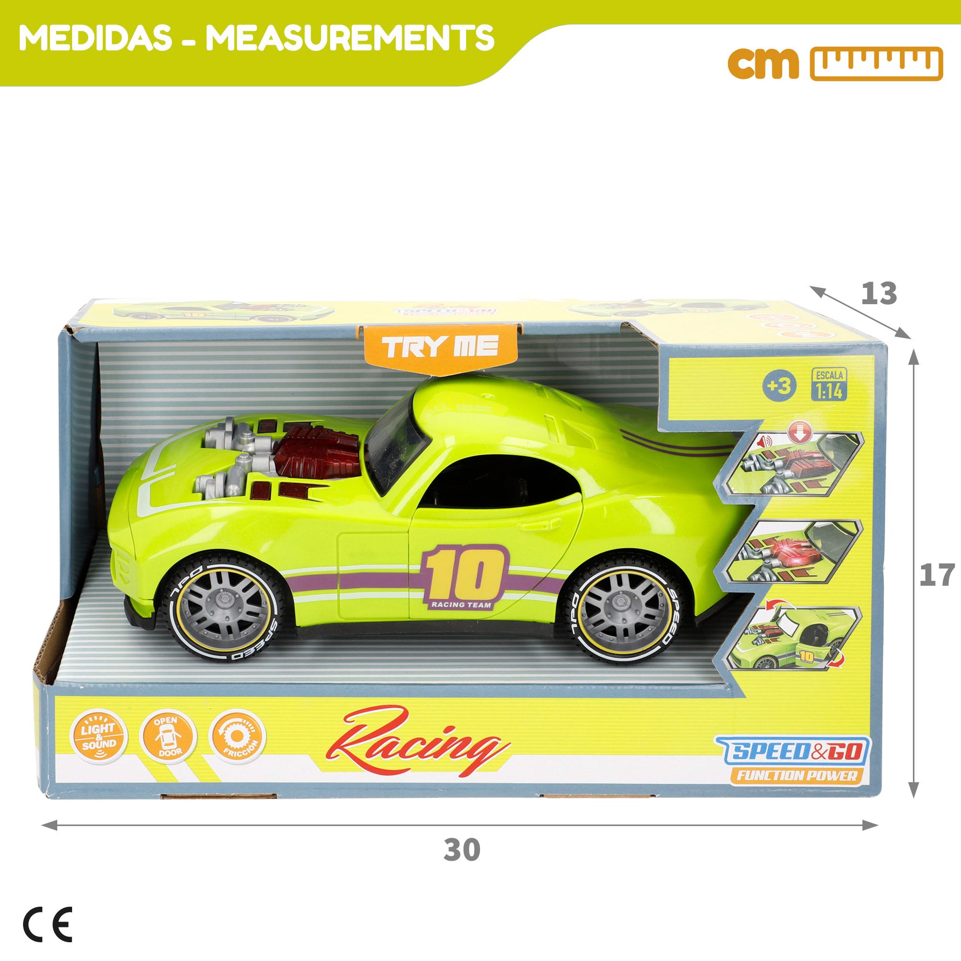 Sinta a adrenalina das corridas com este carro concebido para os verdadeiros fãs de velocidade! O seu design, em umcor verde vibranteVai destacar-se de todos os concorrentes. Basta empurrar para trás e largar para o ver disparar, como se estivesse no meio de uma corrida. Os sons de arranque e de funcionamento do motor tornam a experiência ainda mais realista, enquanto os faróis iluminam a pista durante as emocionantes corridas noturnas. Está pronto para conquistar a vitória?