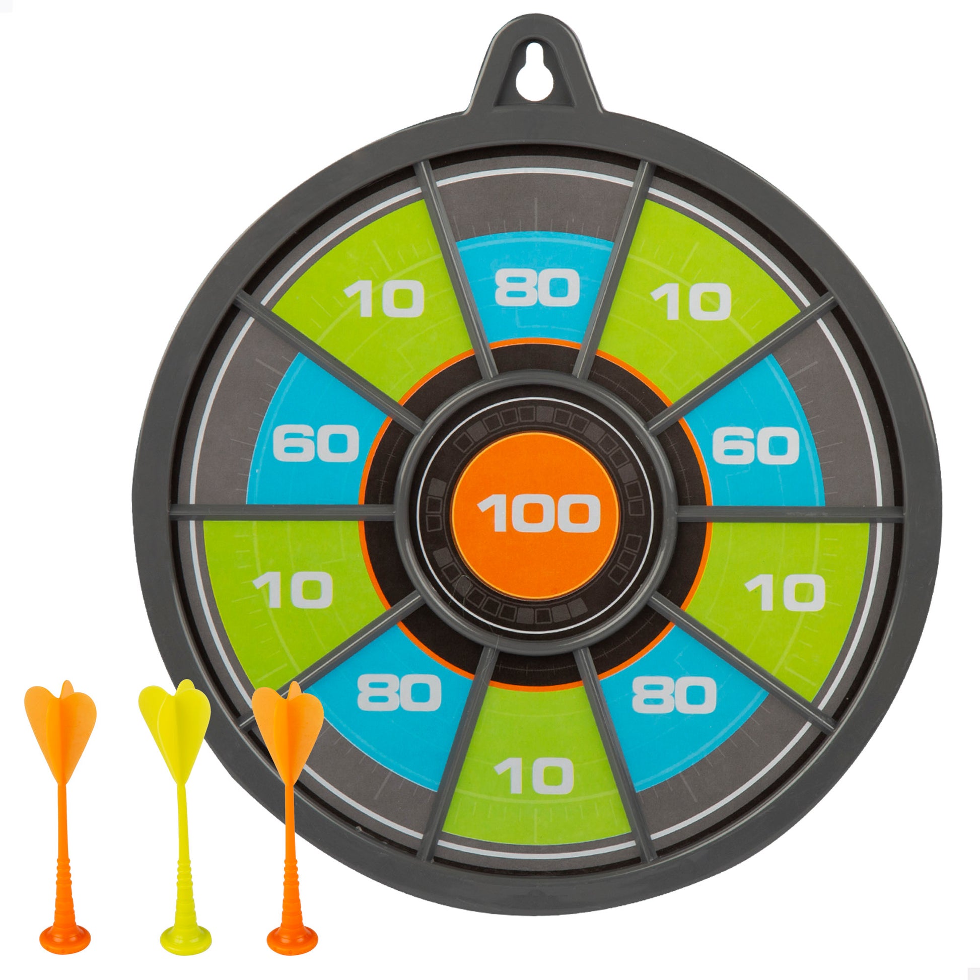 Este alvo inclui3 dardoscom ponta magnética (2 laranjas e 1 amarela).