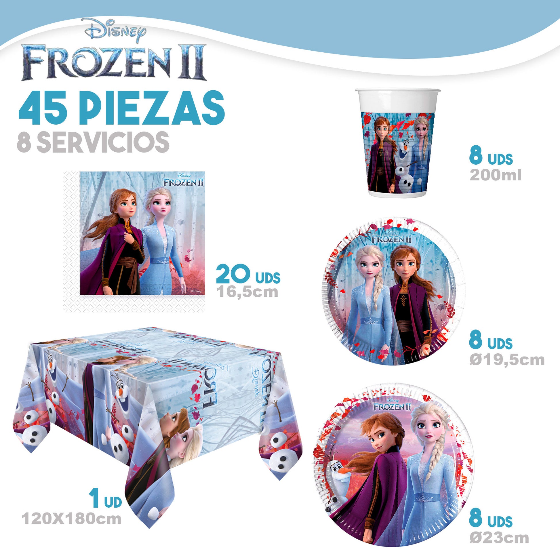 O conjunto contém66 peçasque incluem1 toalha de mesa(120x180 cm),8 copos(200 ml),8 pratos grandes(Ø23 cm),8 pratos pequenos(Ø19,5 cm),20 guardanapos(16,5 cm),1 grinalda de bandeirolas(2,8 m),6 convites com envelopes(9,5 x 14,5 cm),6 sacos de presente(16,5 x 23 cm) e8 balões decorativos(Aproximadamente 28 cm). Todo decorado com as personagens e cores de inverno de Frozen II.