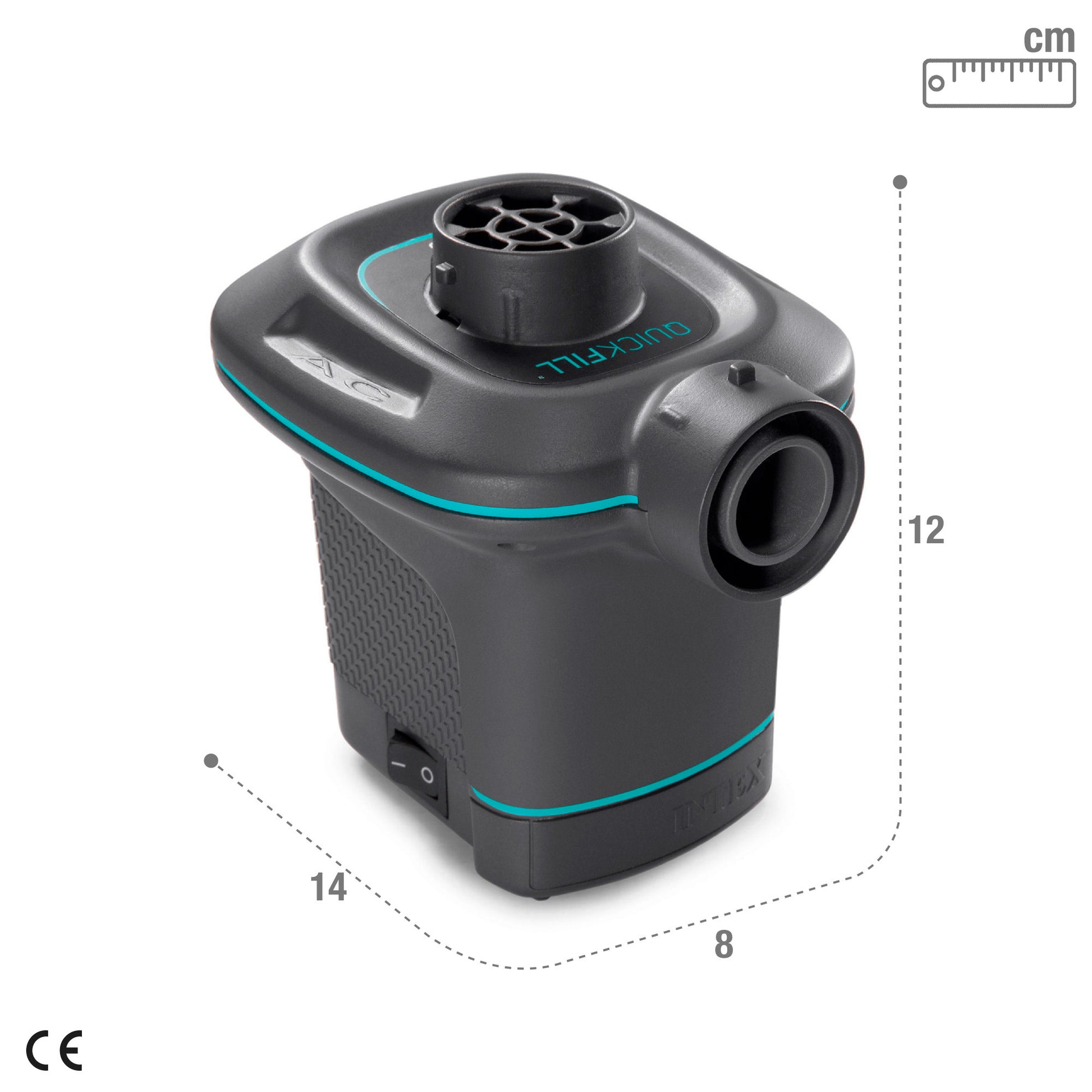 Bomba de ar elétrica INTEX Quick Fill com alimentação de 220-240V. Capacidade de enchimento de 650 litros/minuto. Enche e esvazia de forma rápida e fácil em poucos minutos. Inclui 3 bicos adaptáveis a qualquer válvula. Design compacto e leve. Requer uma tomada elétrica para funcionar. Adequada para uso no interior. Possui protetor térmico de segurança.