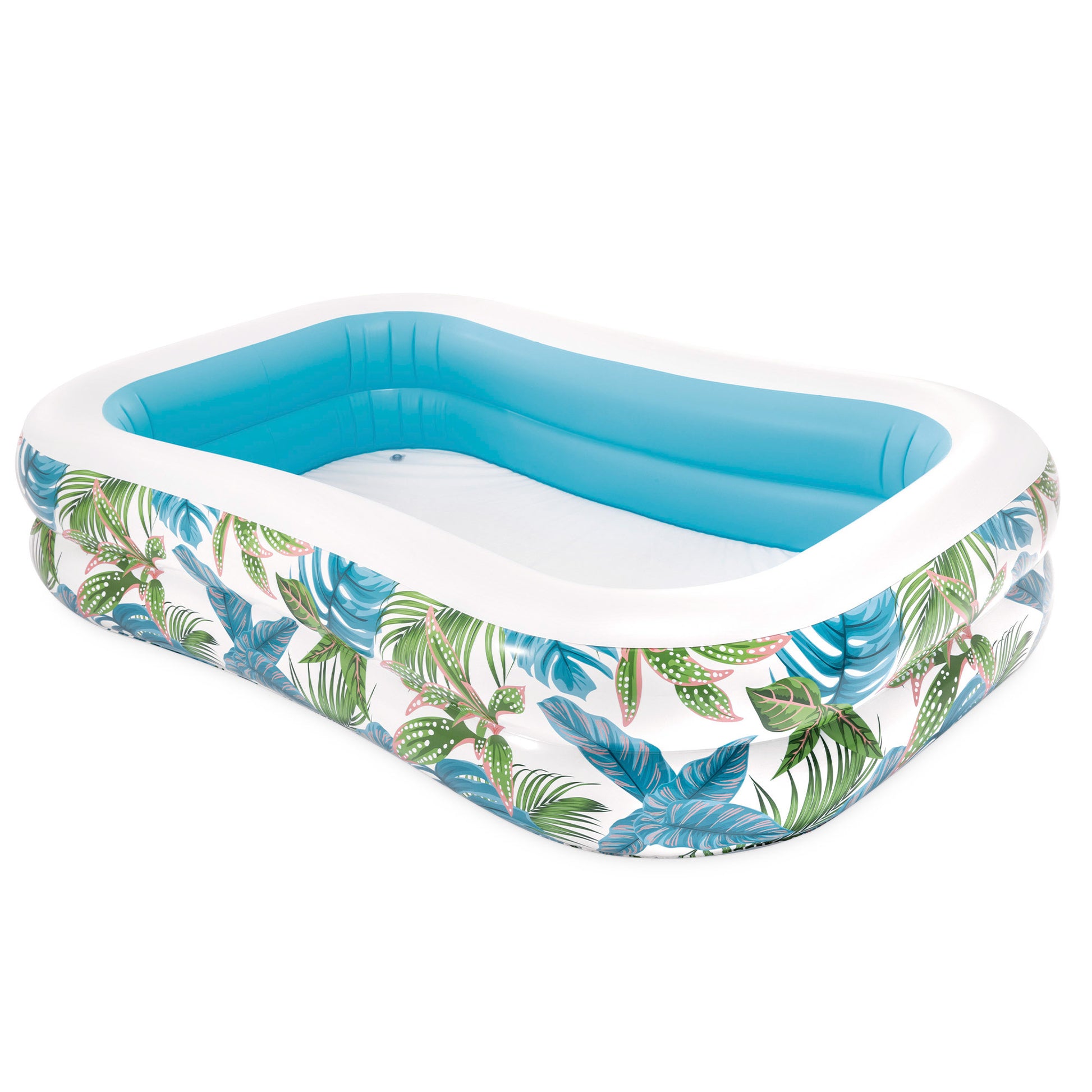 Esta piscina insuflável infantil é perfeita para aproveitar os dias quentes. Tem um formato oval, está decorada com um alegre estampado tropical e tem espaço suficiente para várias crianças se divertirem juntas enquanto se refrescam no jardim ou no pátio.