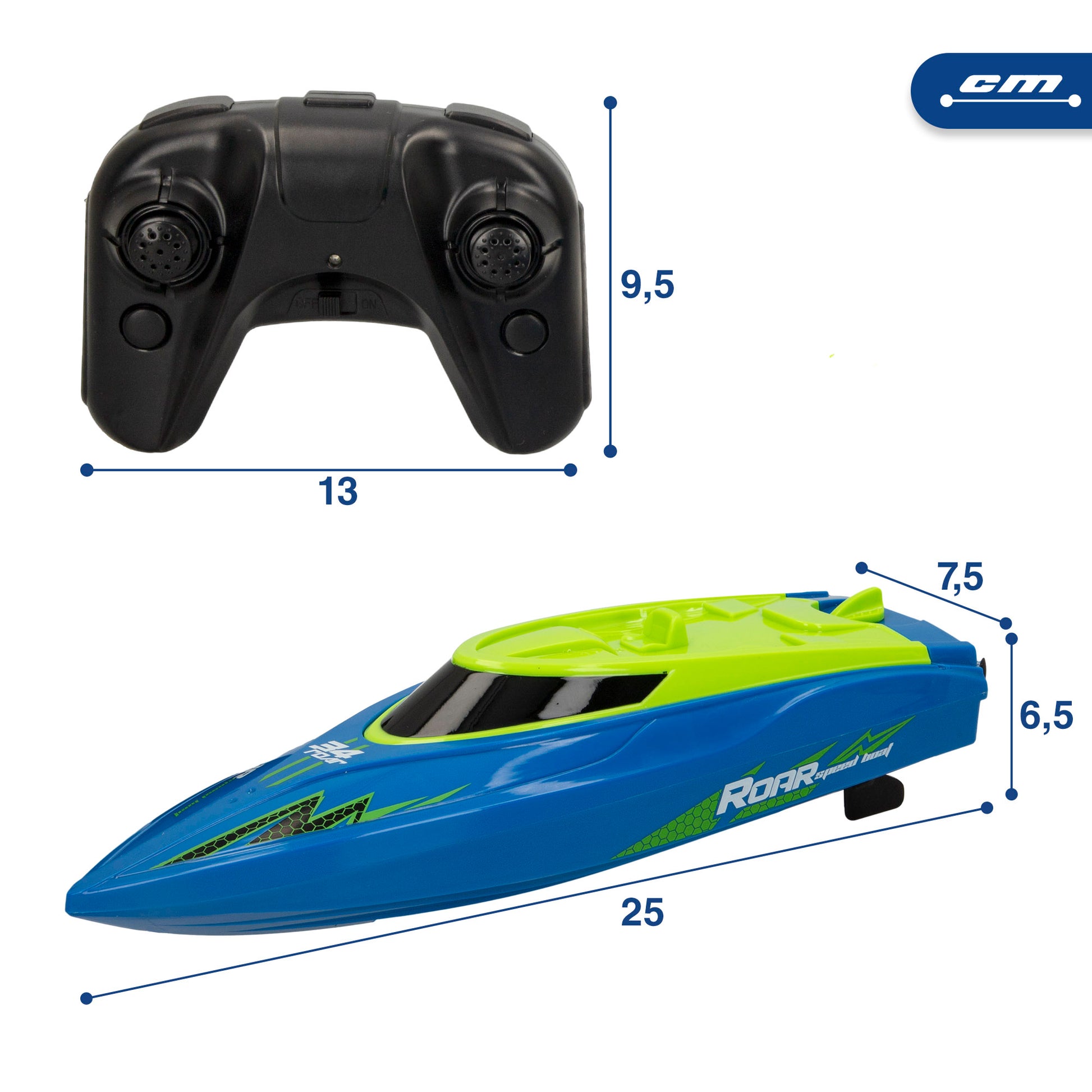 Pratique para se tornar o piloto de barco controlado remotamente mais rápido de sempre no comando deste.Barco telecomandado à escala 1:47Com um design desportivo em azul e verde, inclui duas hélices. Coloque-o na água (na piscina ou na banheira) para o pilotar e impressione todos com a rapidez com que navega!