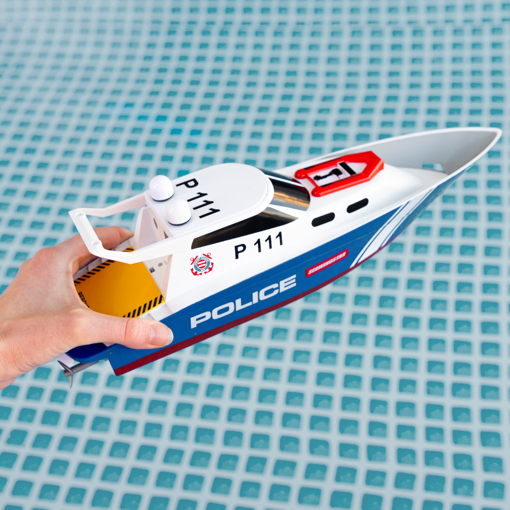 Torne-se o herói do resgate com oBarco policial controlado por rádioCom o seu design autêntico e cores vibrantes que imitam os barcos da polícia, esta lancha garante um passeio suave e emocionante. É perfeita para missões de resgate na piscina ou na banheira!