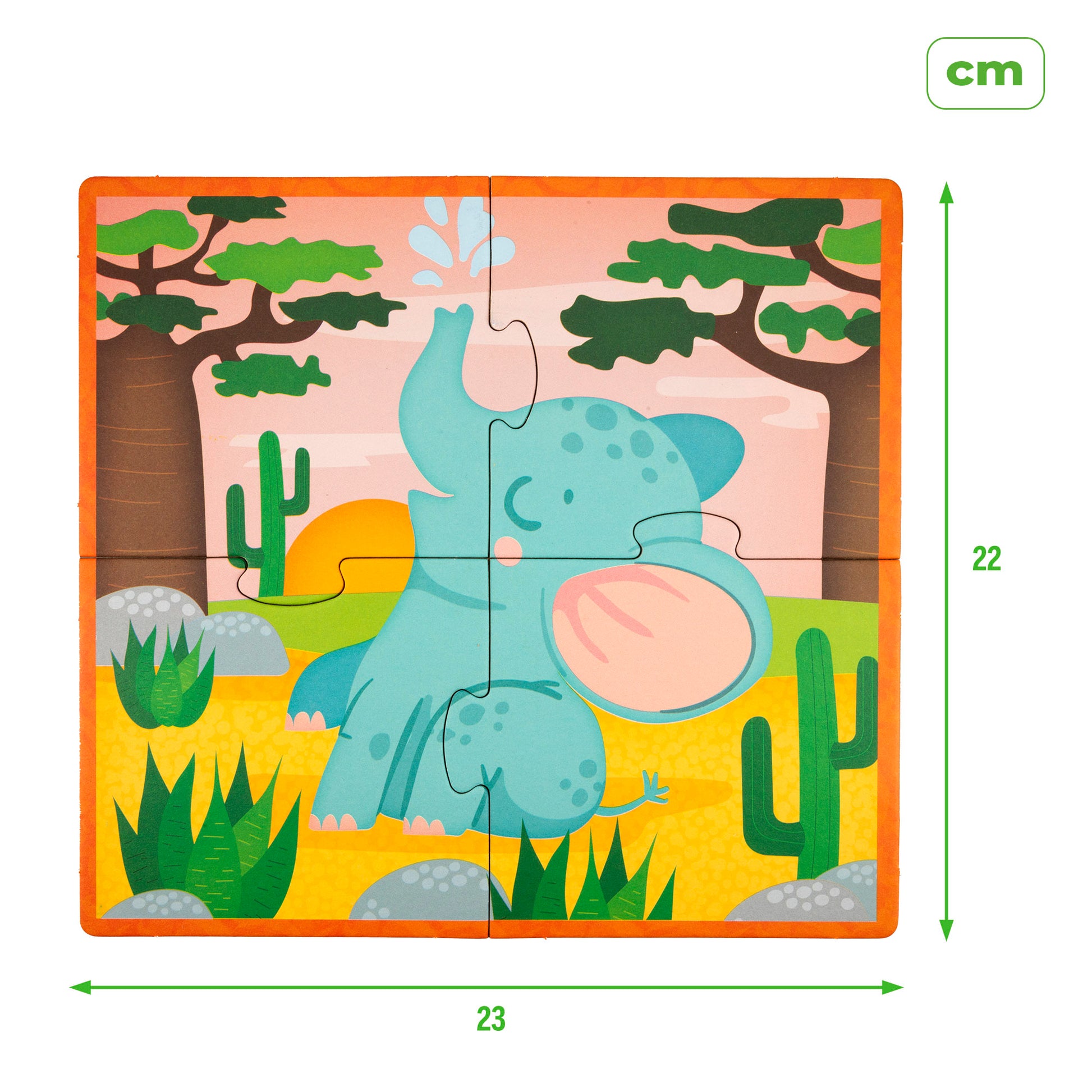 O conjunto de puzzles inclui 4 cubos de madeira com imagens de 6 animais diferentes.(cão, gato, vaca, abelha, pinguim e peixe) e6 puzzles com 4 peças grandes de cartão resistente.Cada peça contém 3 formatos recortados que são extraídos e colocados após a montagem do puzzle.