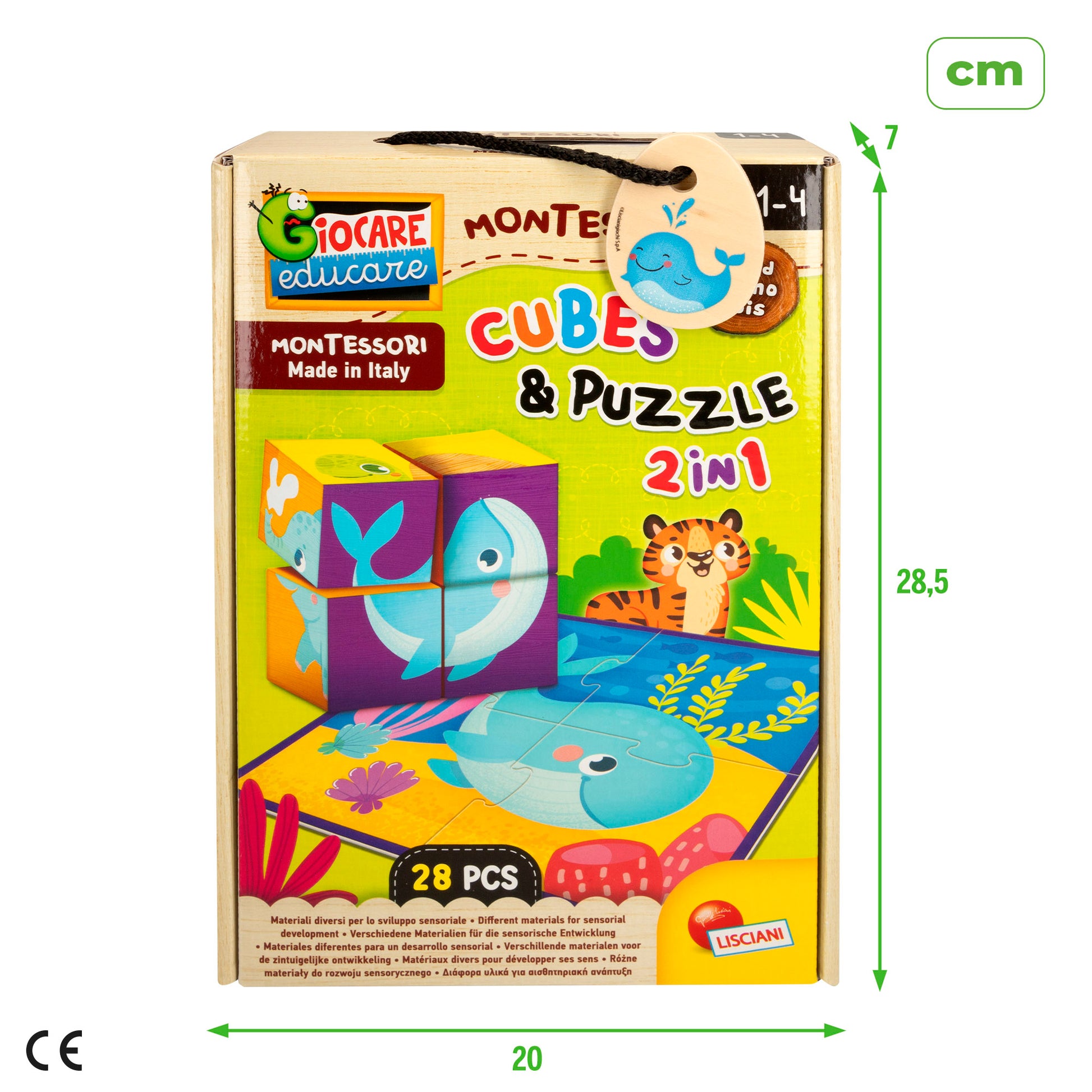 Consegues montar todos os puzzles e colocar as peças e os cubos nos seus devidos lugares? Teste o seu engenho com este desafio!Conjunto de puzzles de animais 2 em 1 da linha Giocare Educare MontessoriLisciani! Disponha todas as peças sobre uma superfície e monte os 6 puzzles um a um. Se quiser aumentar o nível, retire as silhuetas espalhadas entre as peças para que, depois de montadas, as possa colocar no sítio certo. De seguida, pegue nos cubos de madeira e, utilizando as imagens-guia transparentes, monte as 6 imagens de animais disponíveis, uma a uma.