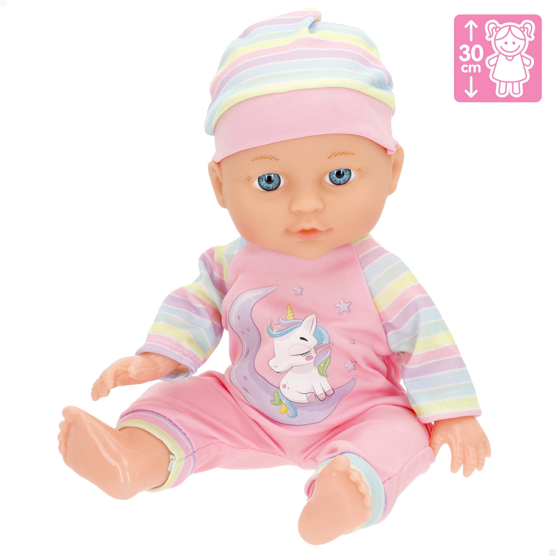 O conjunto contém umboneca bebé de 30 cmcom corpo rígido e membros articulados, vestido comPijama e chapéu a combinar com estampado de unicórnios e riscas em tons pastel.Inclui também umcanguru rosa para bebéscom correia azul e cinto de segurança, além de ummamadeirapara que ele nunca fique sem comida.