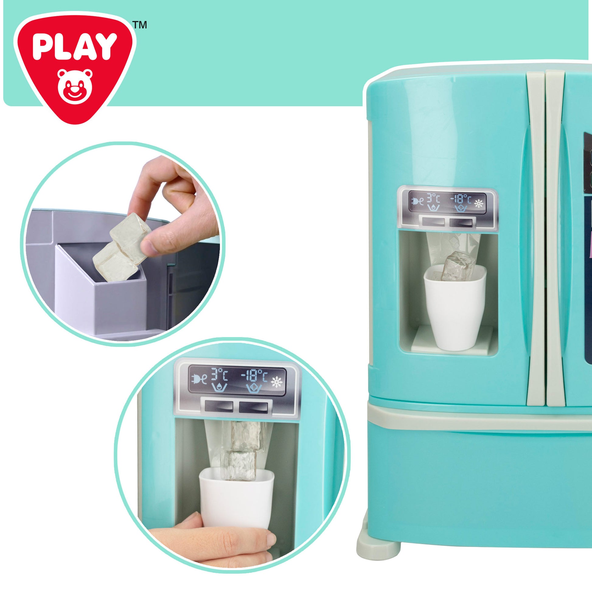 Baixe o carrinho de compras e encomende todos os alimentos que precisam de ser mantidos frescos ou congelados dentro deste espaço.frigorífico de brinquedoJOGUE! É umFrigorífico de duas portas com gaveta de congelador grande e dispensador de água e gelo incorporado.Sim, leu bem. Colocar água ou gelo num copo é tão fácil como pressionar a alavanca com o próprio copo! Utilize o congelador para armazenar carne, peixe ou legumes para os manter frescos durante mais tempo, ou guarde os seus alimentos no frigorífico para evitar que se estraguem.frigorífico de brinquedoÉ retro e azul, com prateleiras, estantes e uma bandeja para ovos, e inclui ilustrações tanto no interior como no exterior para dar realismo ao jogo. Além disso, uma das suas portas tem...6 botões que, quando pressionados, emitem sons divertidos..