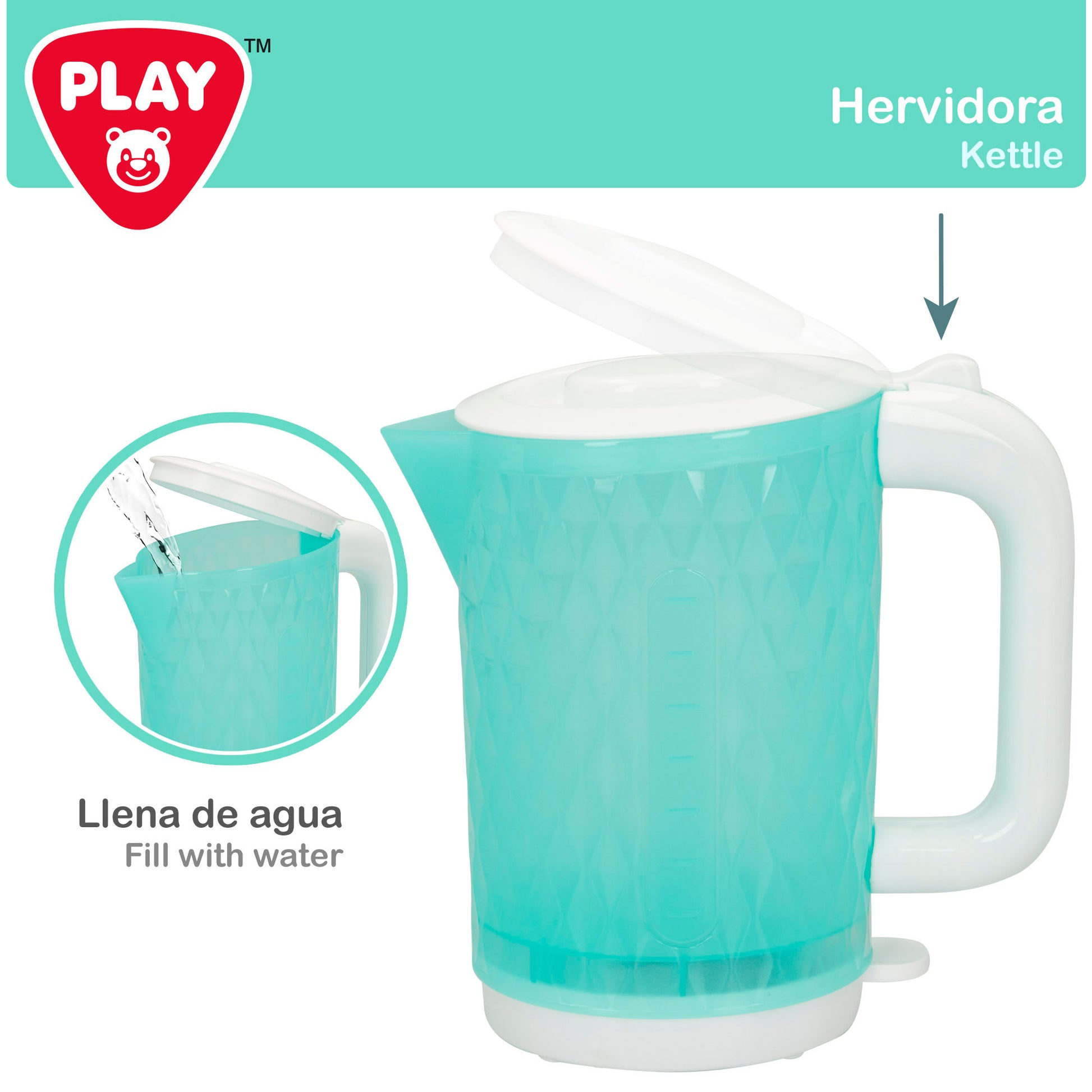 É um brinquedo.Recomendado para crianças a partir dos 24 meses. A chaleira Funciona com 2 pilhas AAA.Incluído. Pode ser complementado com outros.eletrodomésticos de brinquedoPara melhorar a experiência de jogo.