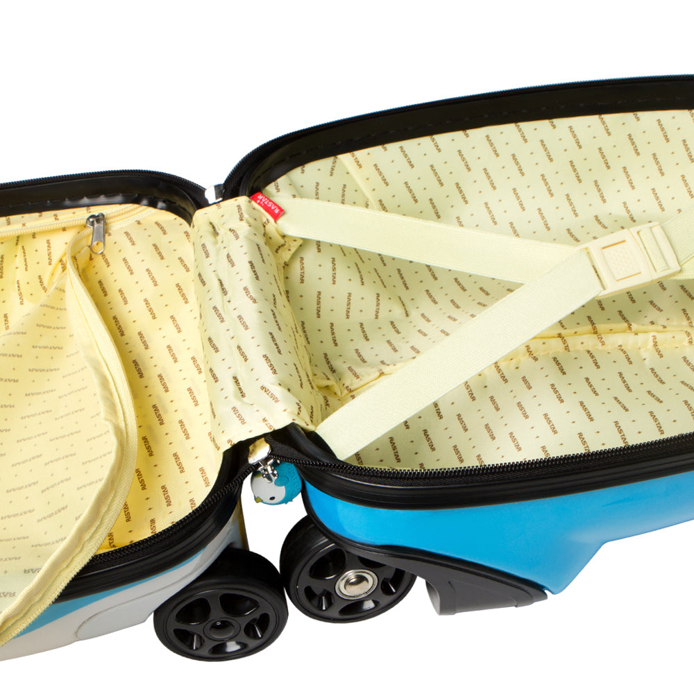 Mova a sua mala com rodas RASTAR com controlo remoto em qualquer direção! Esta mala possui uma estrutura rígida e compacta feita de plástico resistente. O seu formato oval está dividido em dois compartimentos que abrem com um fecho duplo. No interior, existem duas cintas de fixação para manter a sua bagagem segura e um bolso interior com fecho.