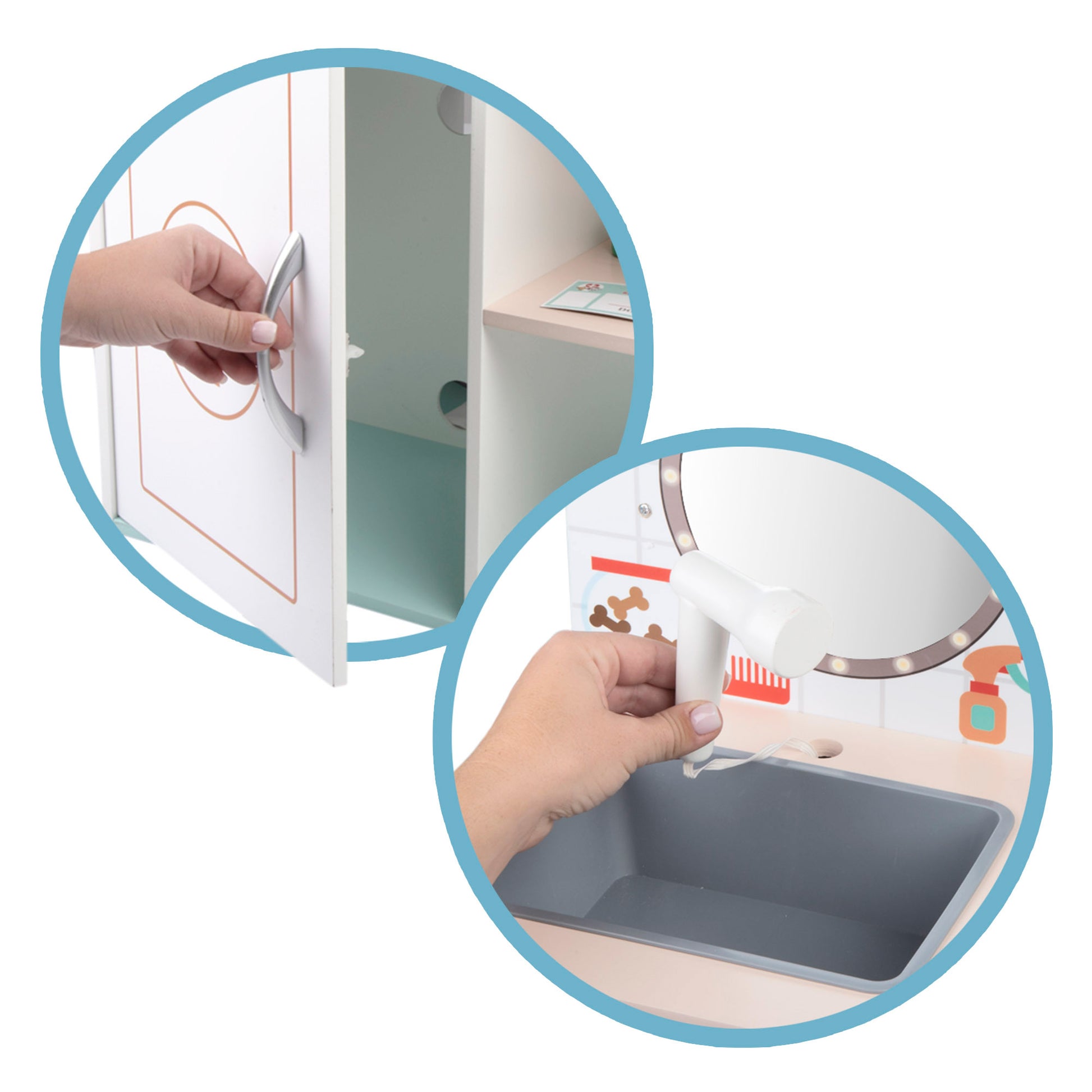 Gosta de jogos de médico? Descubra a sua verdadeira vocação com este!Hospital de madeira 3 em 1:Centro veterinário, salão de beleza para animais de estimação e clínica de exames médicos para pessoas.Diversão garantida! Cuide dos pequenos animais que visitam o seu hospital, pese-os, meça a temperatura e examine as suas patas. Ou mime-os no salão de beleza; pode dar-lhes banho facilmente graças à torneira removível. Mas não é só isso! Também pode brincar aos médicos e examinar os seus pacientes com raios X ou realizar testes de visão utilizando o painel de letras. O centro veterinário de brinquedo tem um armário e prateleiras para guardar todos os instrumentos e acessórios de forma organizada. Será veterinário, médico ou tosquiador de cães? Você escolhe o que vai fazer todos os dias!