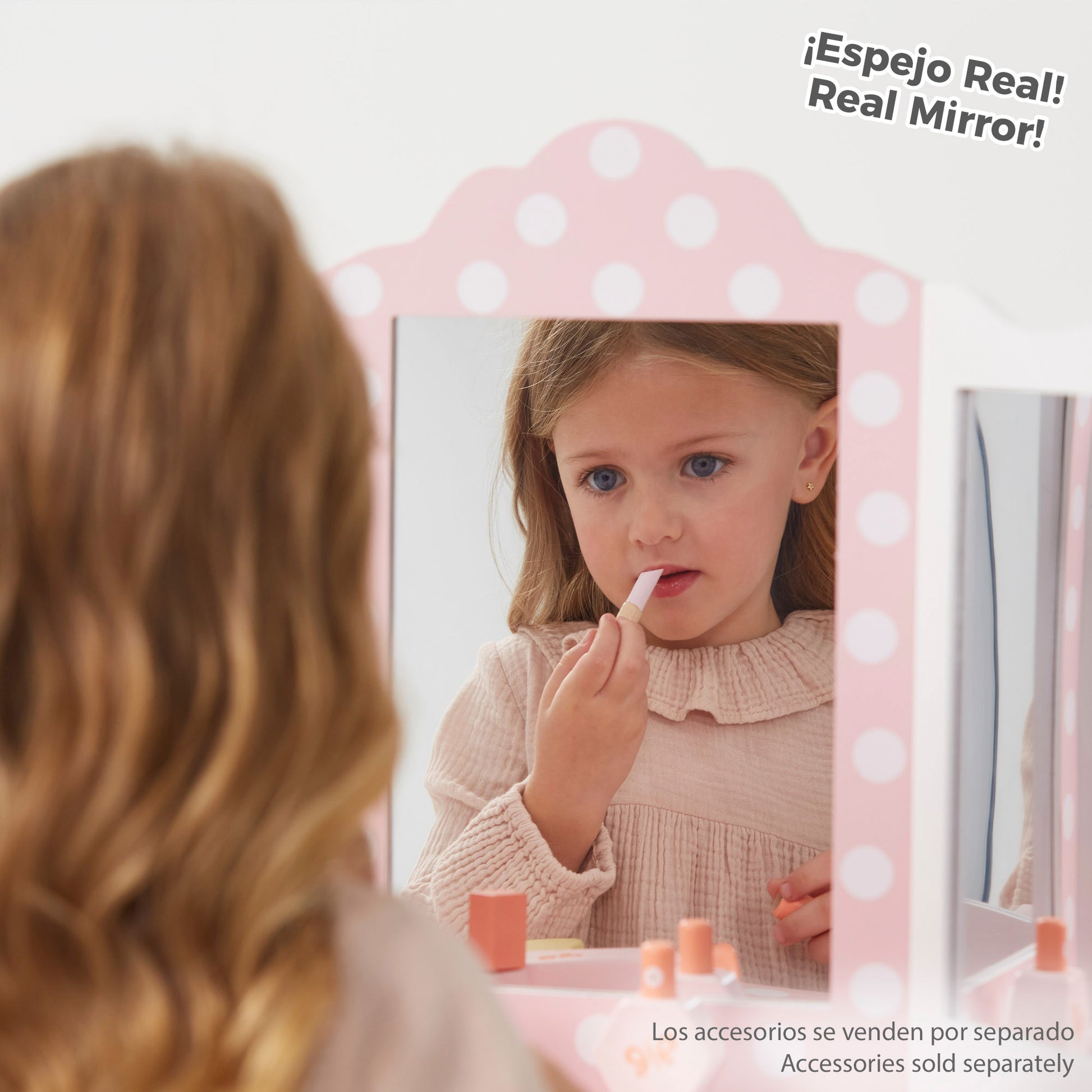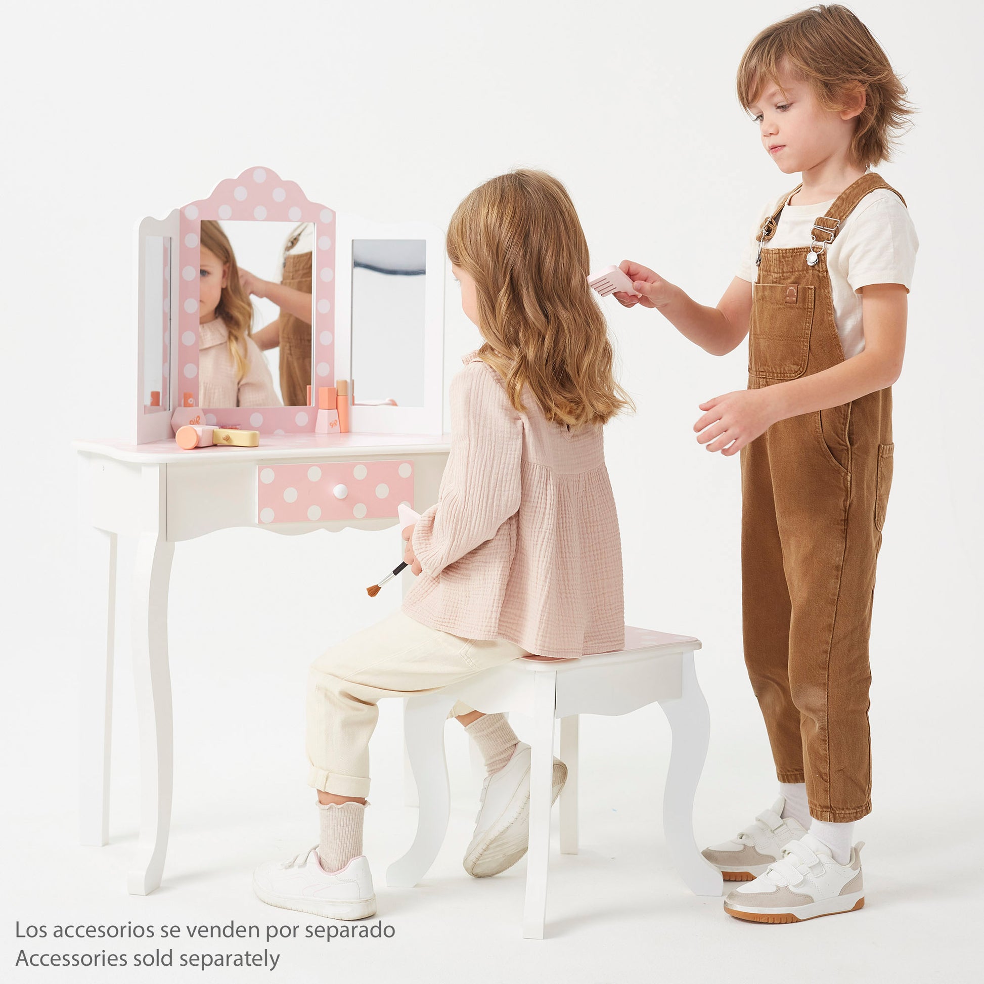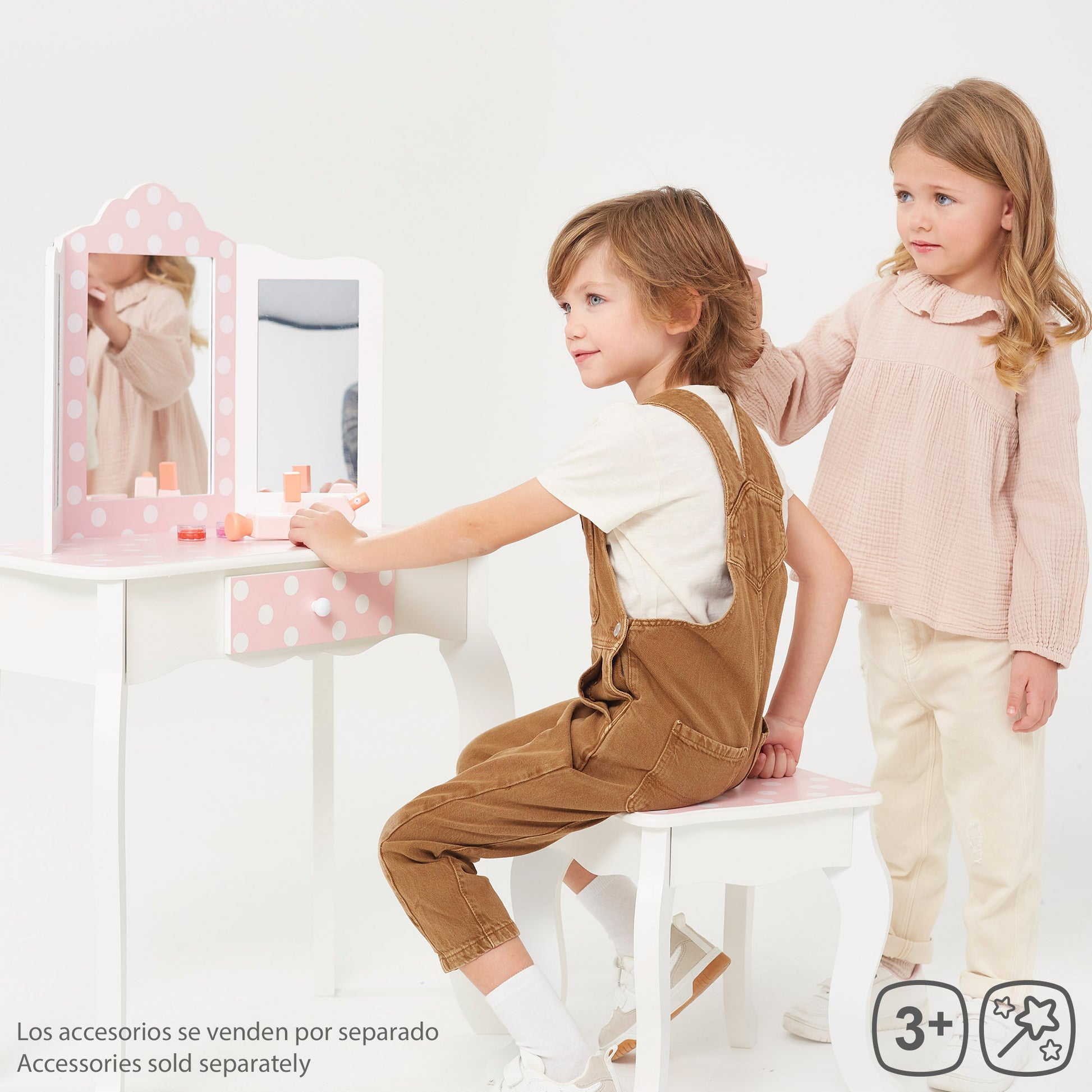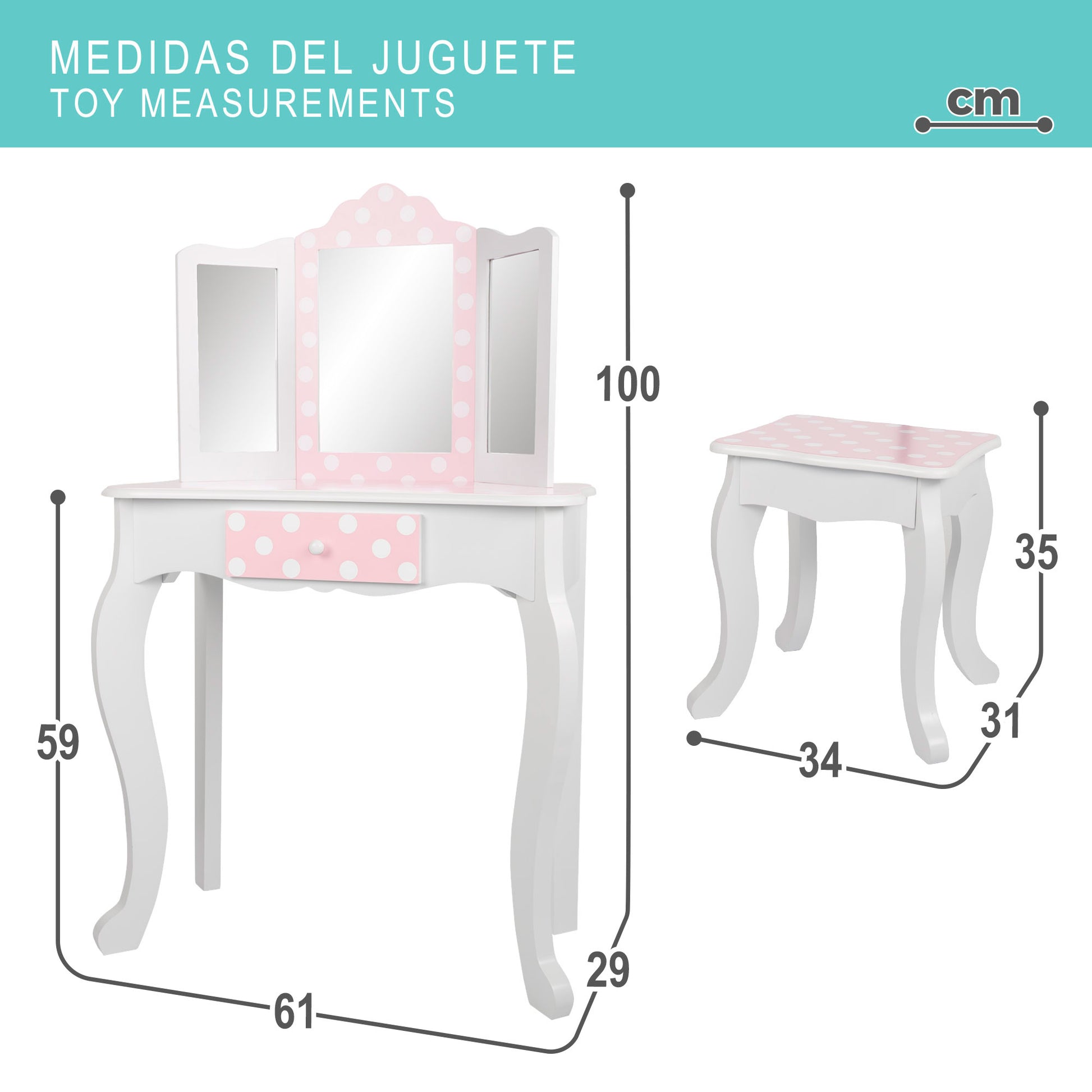 A vaidade de sonho de qualquer menino ou menina torna-se realidade neste lugar.Elegante toucador com banquetaUm bonito armário de madeira com uma superfície espaçosa para todos os seus produtos de beleza e higiene pessoal. Possui uma prática gaveta para guardar artigos mais pequenos e três grandes espelhos fixos dispostos numa curva de 180°, permitindo ver-se em detalhe de todos os ângulos. O seu design elegante...Design branco com detalhes em rosa e bolinhas.Esta penteadeira combina perfeitamente com o resto da mobília do quarto. Uma mesa de maquilhagem para meninas e meninos que proporcionará um espaço próprio para brincar e aprender, fazendo as delícias de miúdos e graúdos.