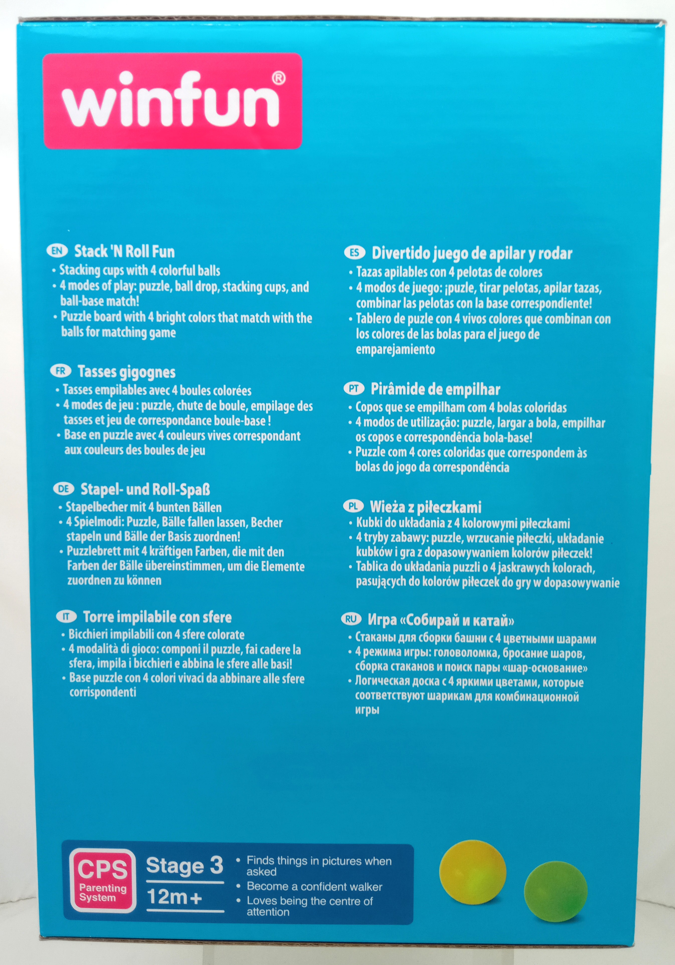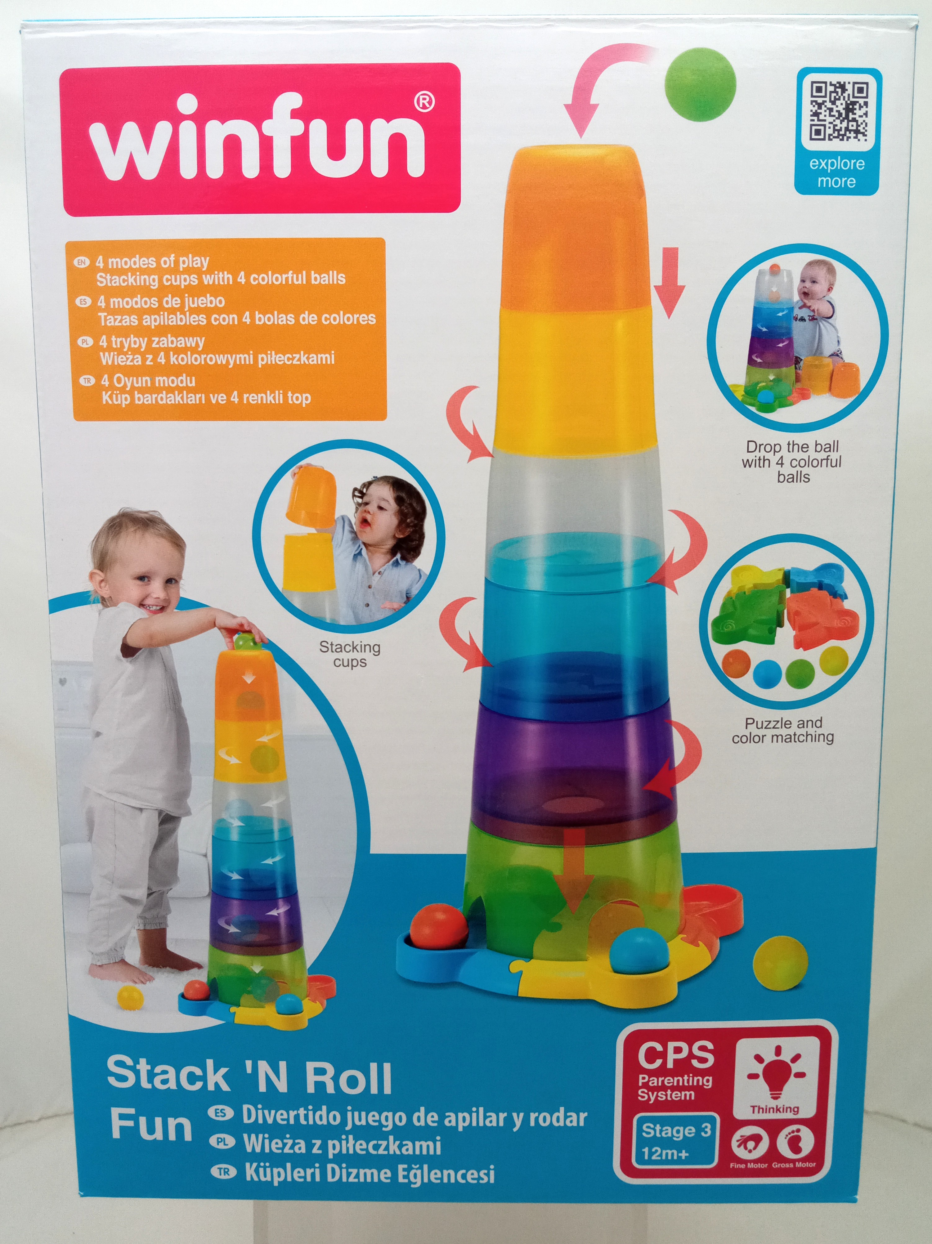 A torre tem até6 níveisdividido em copos coloridos:verde,roxo,azul,branco,laranjaeamareloCada copo tem um orifício e um caminho em espiral para lançar o4 bolinhasDe cima para baixo, rodando-as manualmente. Inclui 4 bolas do tamanho ideal para as crianças pequenas brincarem.