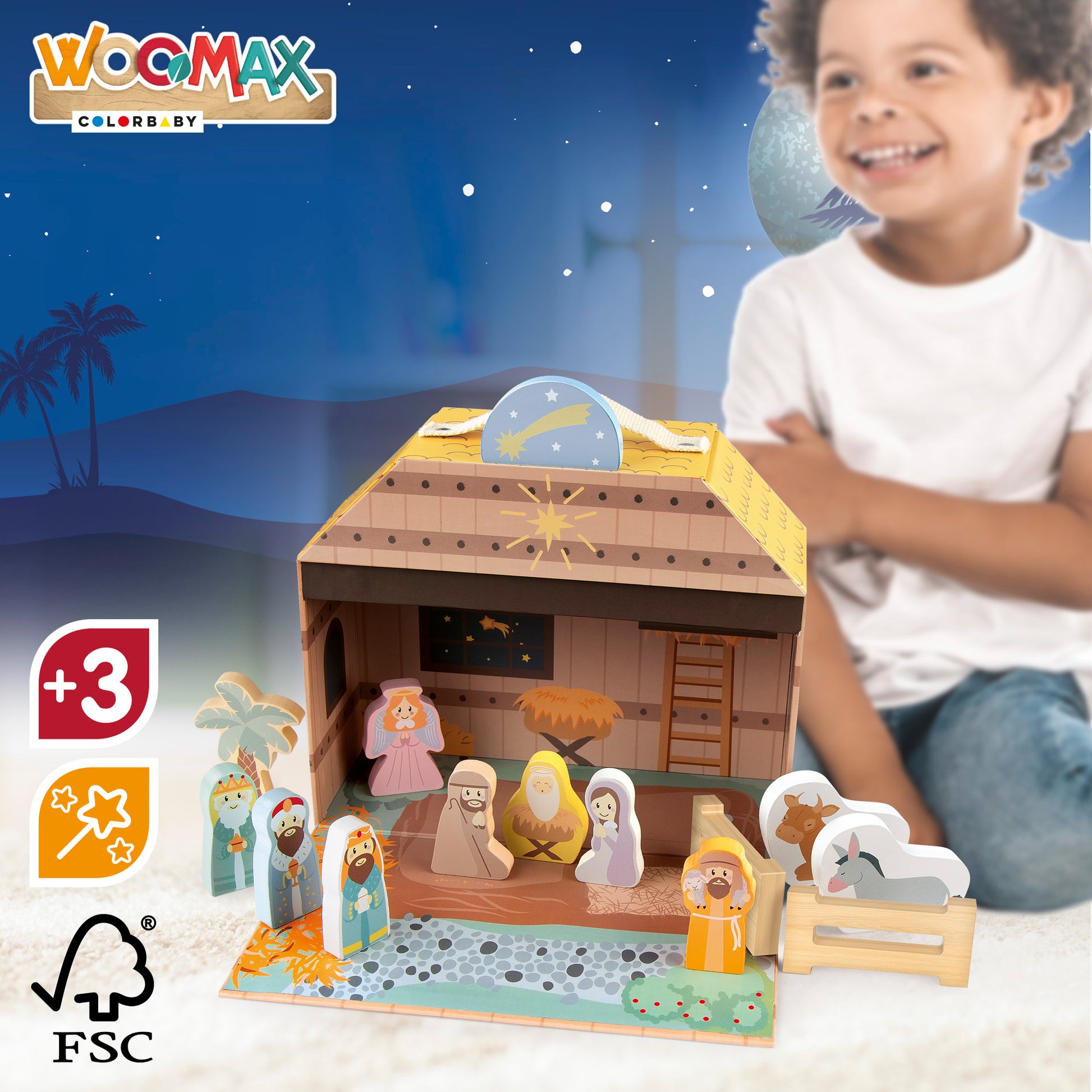 A mala portátil é fabricada em madeira natural, reciclável e ecológica, com bordas arredondadas e lisas para garantir a segurança das crianças. As peças têm impressão em ambos os lados. Este brinquedo é recomendado para crianças com mais de 3 anos. O seu pequenote vai desfrutar do Natal ainda mais com o seu próprio presépio de brincar. Vamos brincar com o WOOMAX!