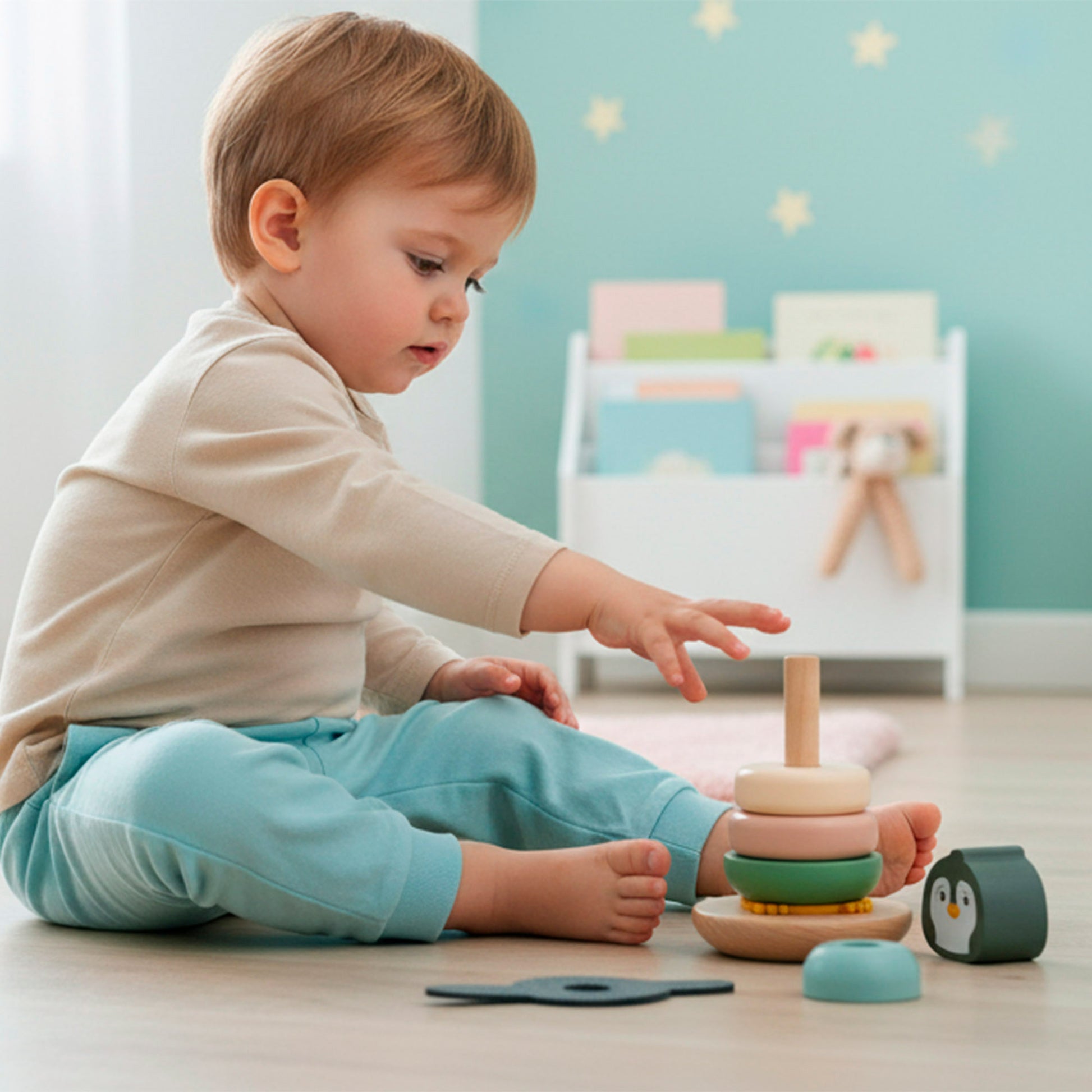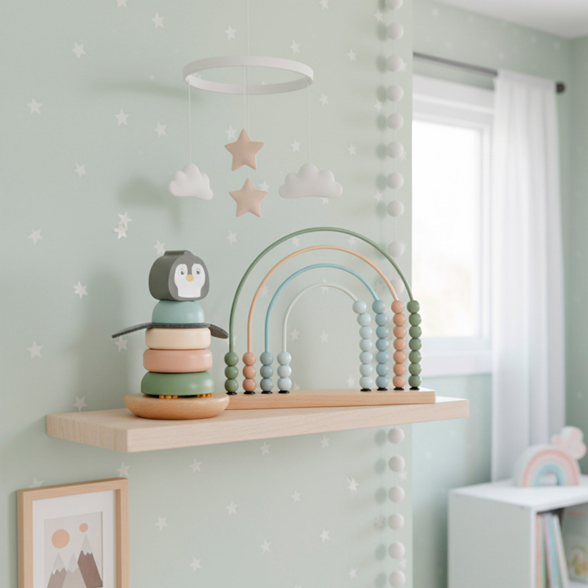 O conjunto consiste numábacoem forma de arco-íris com base em madeira e 5 arcos em metal com missangas em tons pastel; umempilhávelum conjunto de 5 peças com uma base redonda, anéis de diferentes tamanhos e um pinguim fofinho no topo; e umintertravávelCom base em madeira e 6 formas geométricas que se encaixam nos seus respetivos lugares.