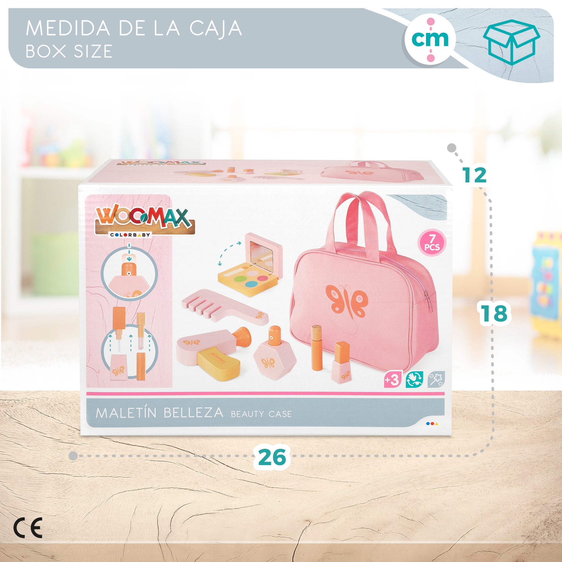 Nécessaire de madeira para criança WOOMAX. Inclui 1 batom, 1 verniz, 1 secador de cabelo, 1 pente, 1 perfume, 1 paleta de blush com espelho e 1 nécessaire rosa com borboleta. Recomendada para crianças a partir dos 3 anos. Promove a autoestima, a coordenação motora fina, a imaginação e a coordenação óculo-manual. Este brinquedo faz parte da iniciativa "Partilhar e Reciclar", uma ação solidária da Fundação Crecer Jugando que recolhe brinquedos para doação a instituições de solidariedade espanholas.