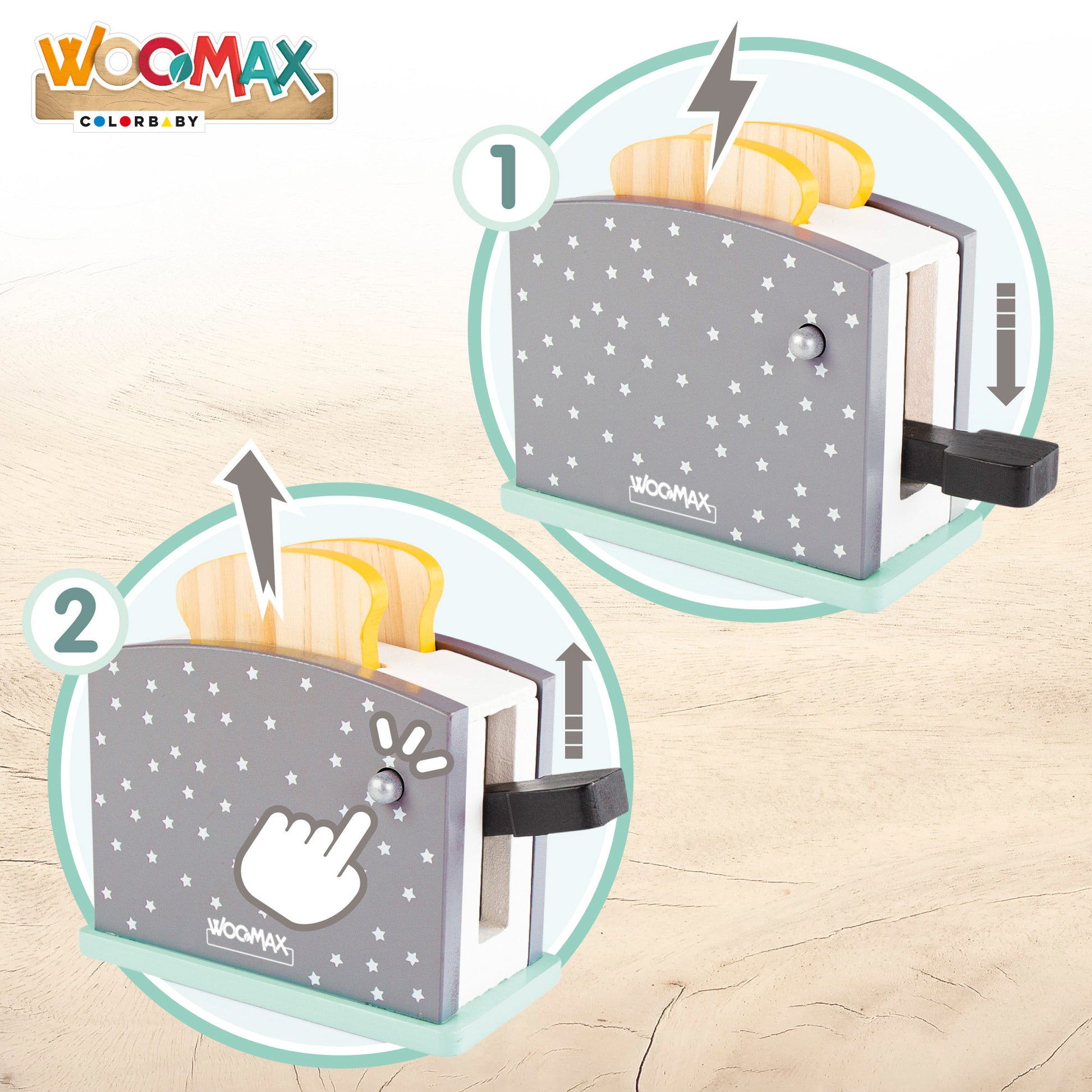 Prepare deliciosas tostas com a torradeira de madeira WOOMAX, feita de material 100% natural, ecológico e reciclável. Inclui 4 fatias de pão, manteiga, 1 prato e 1 faca. Introduza o pão e baixe a alavanca. Pressione o botão e a torrada saltará! O design arredondado e elegante apresenta cores pastel suaves em cinzento e azul claro com estampado de estrelas. Este brinquedo educativo desenvolve a imaginação e a coordenação motora. Indicado para crianças a partir dos 24 meses. Este brinquedo faz parte da iniciativa "Partilhe e Recicle", uma ação solidária da Fundação Crecer Jugando que recolhe brinquedos para doação a instituições de solidariedade espanholas.